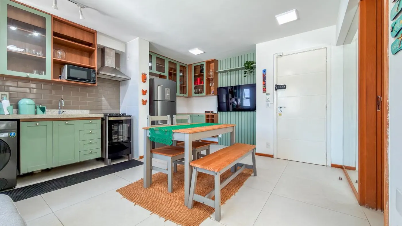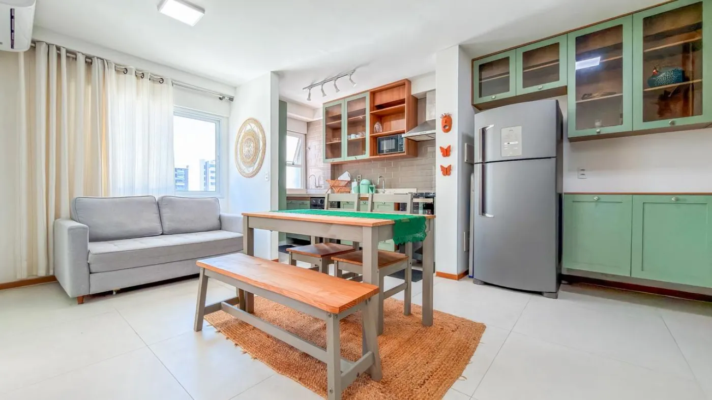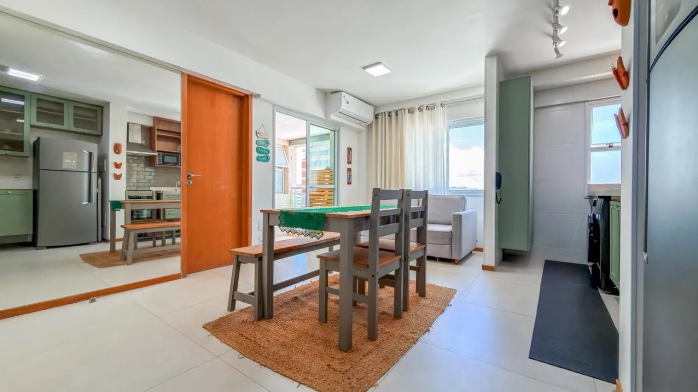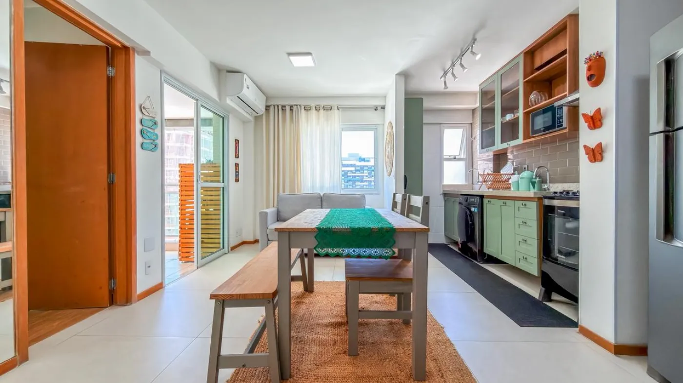 O imóvel possui sala ampla para dois ambientes integrada à varanda, proporcionando ótima ventilação e iluminação natural. Conta com 1 suíte confortável, cozinha funcional com área de serviço e 1 vaga de garagem. O apartamento foi reformado, apresentando um padrão moderno e pronto para morar.