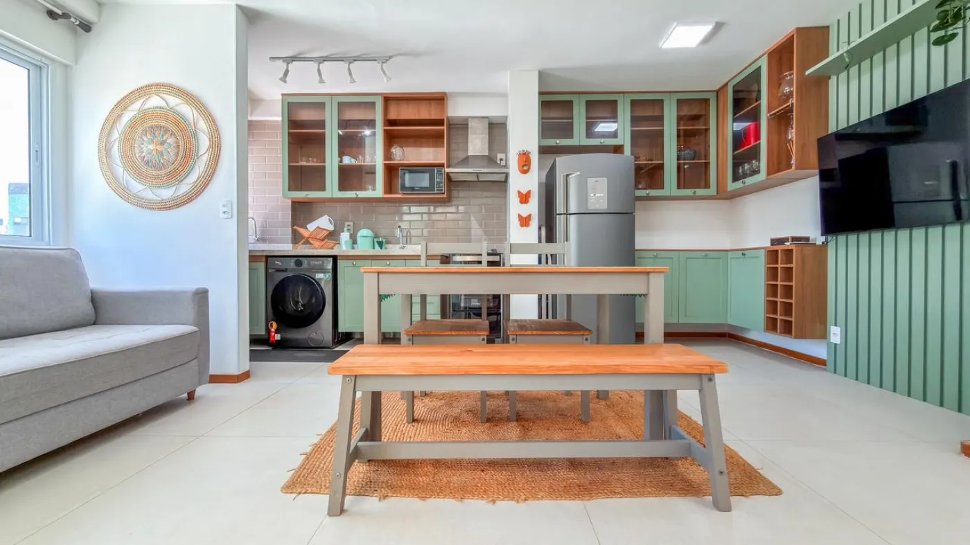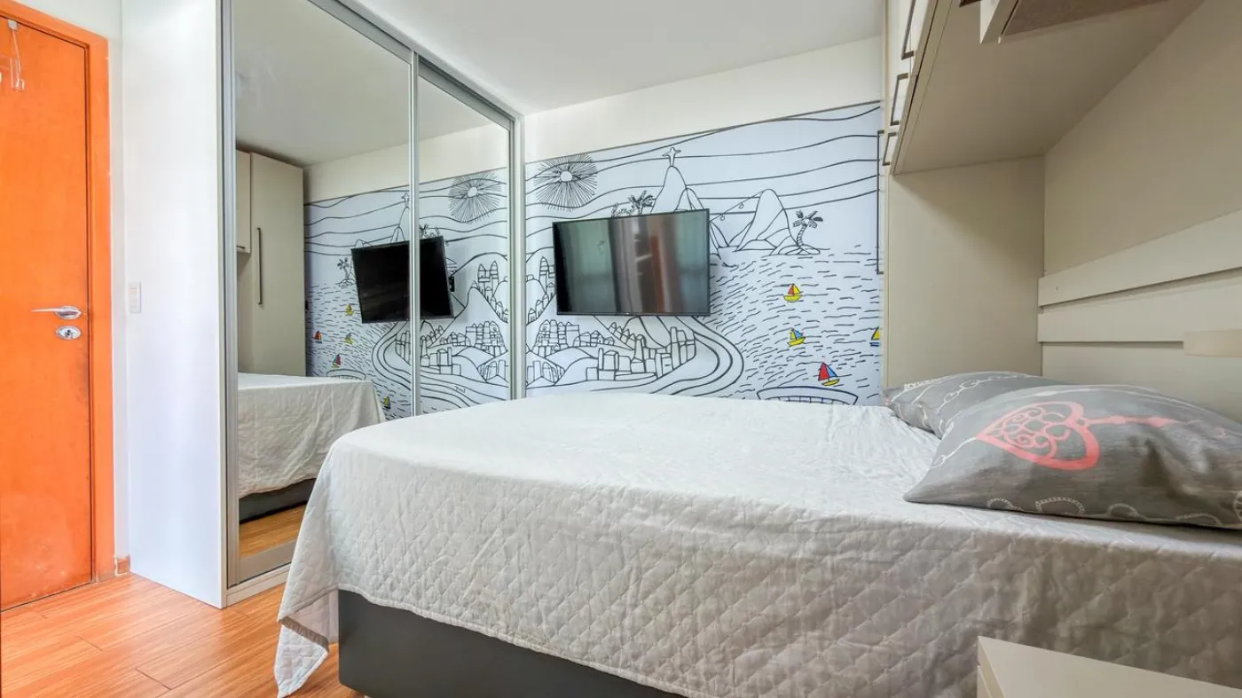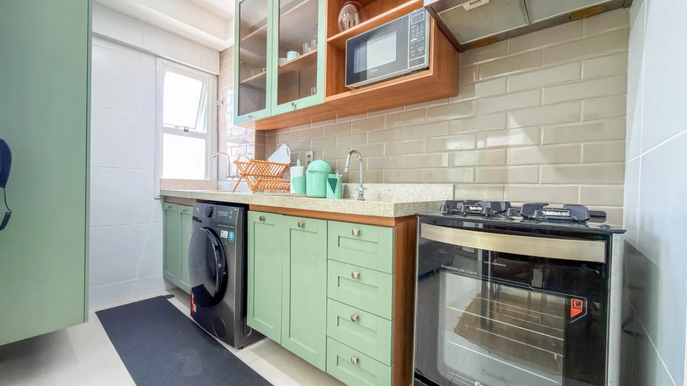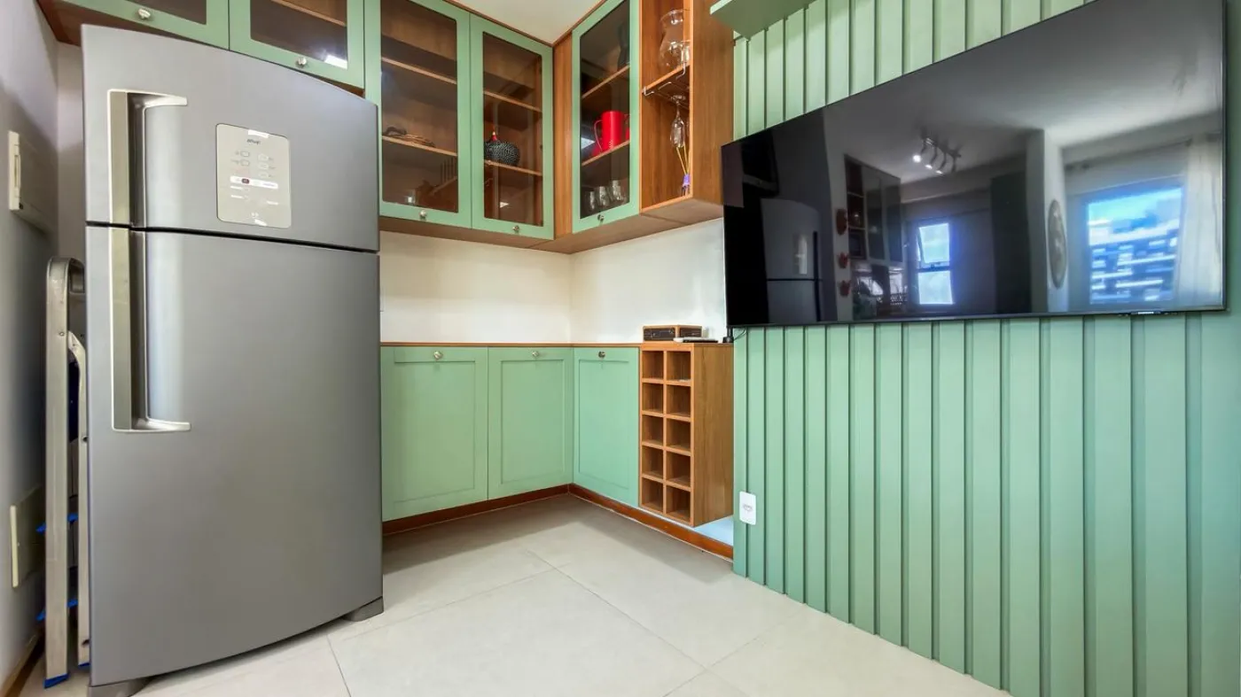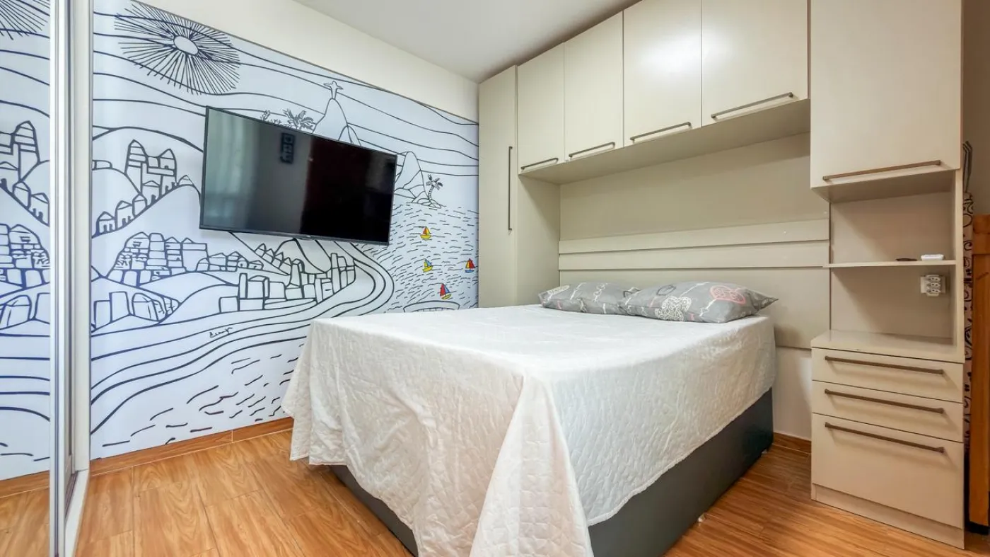 O imóvel possui sala ampla para dois ambientes integrada à varanda, proporcionando ótima ventilação e iluminação natural. Conta com 1 suíte confortável, cozinha funcional com área de serviço e 1 vaga de garagem. O apartamento foi reformado, apresentando um padrão moderno e pronto para morar.