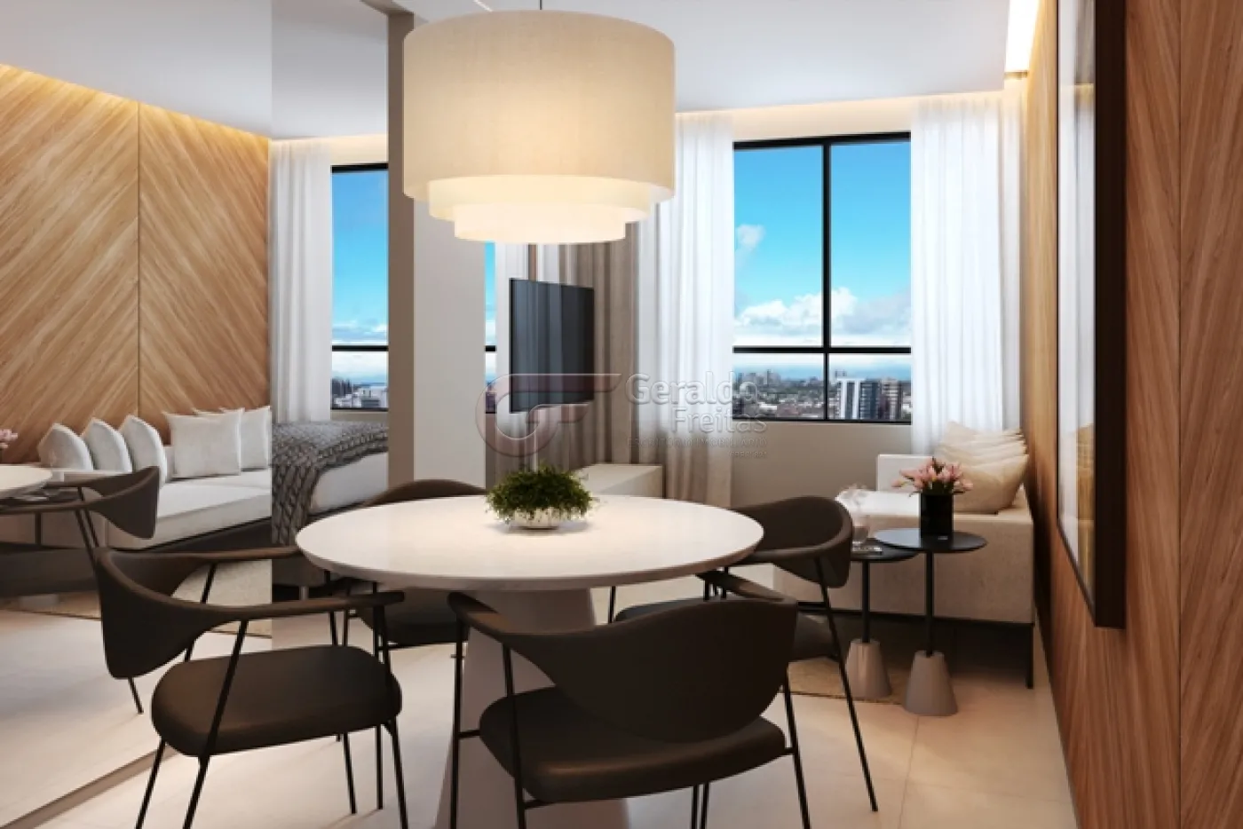 A unidade 1 quarto com área de 39m², dispõe de cozinha com apoio, sala de esta/jantar e uma suíte.